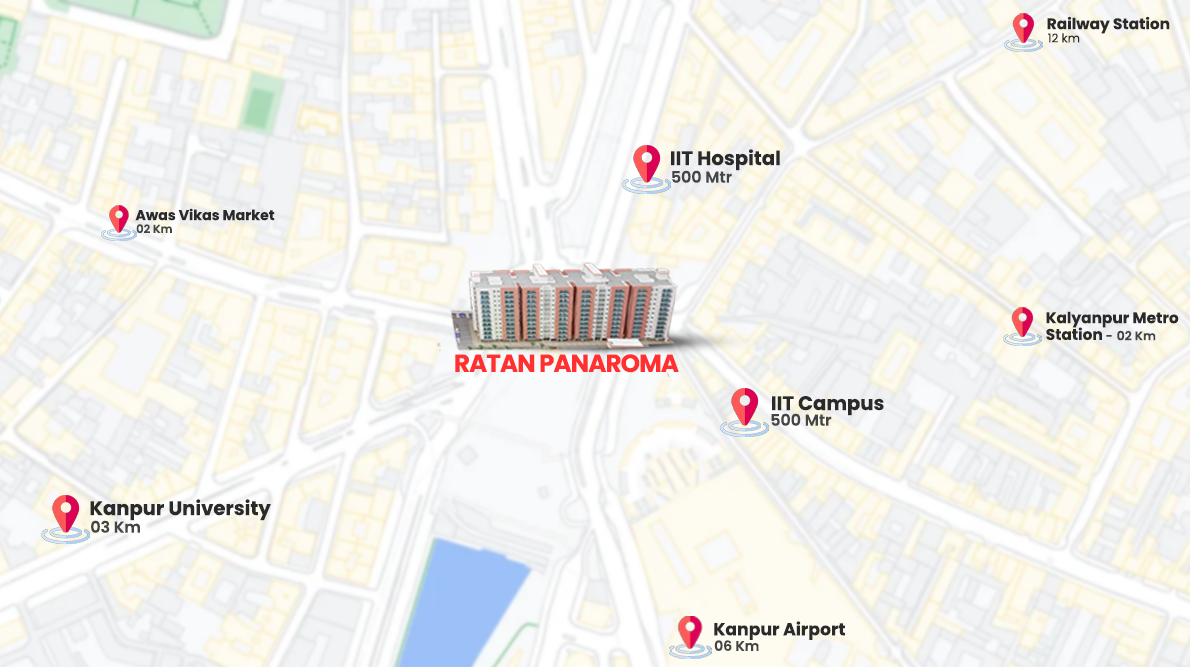 Situated in Kalyanpur, Ratan Panorama provides easy access to: Kalyanpur Market (1 km) Upcoming Metro First Station Kanpur IIT (1.5 km) Kanpur University (3 km) Hospitals (1 km) CBSE and ICSE Schools (1 km)